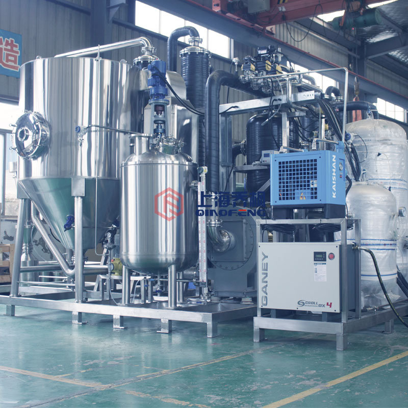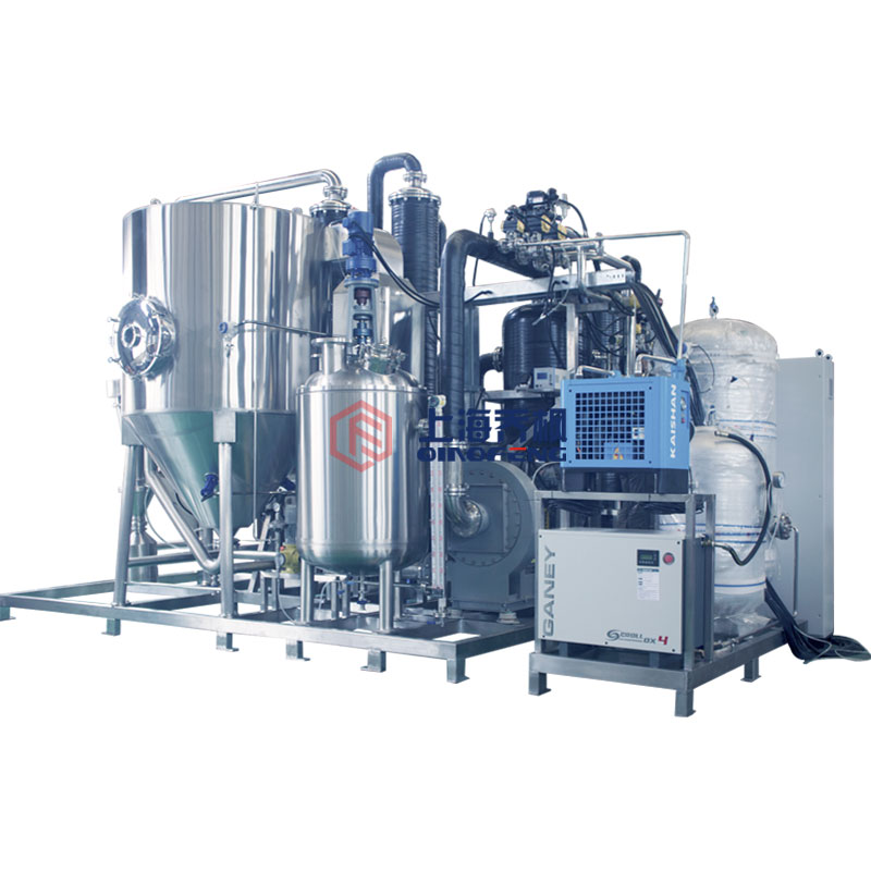 設備主要由:送料系統(tǒng)、加熱系統(tǒng)、霧化系統(tǒng)、噴霧干燥系統(tǒng)、惰性氣體循環(huán)系統(tǒng)、產品回收系統(tǒng)、冷凝系統(tǒng)組成。