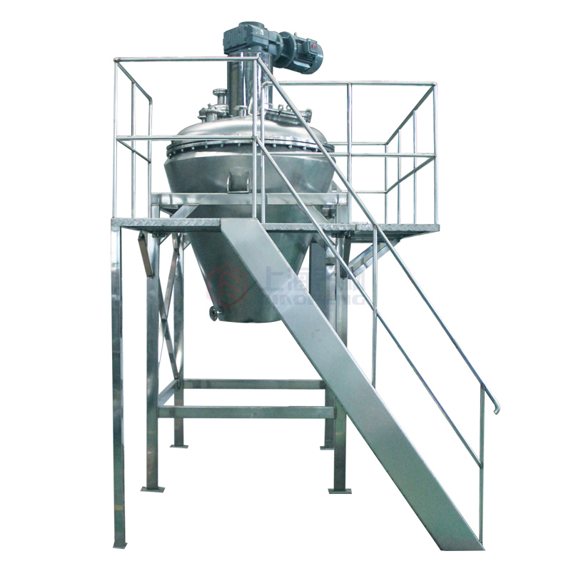 本機(jī)由加熱錐體設(shè)有加熱夾套,熱源為熱水、導(dǎo)熱油或低壓蒸汽,從而使錐體內(nèi)壁保持一定的的溫度。變頻調(diào)速電機(jī)經(jīng)平行斜齒輪減速機(jī),驅(qū)動(dòng)單螺帶攪拌器旋轉(zhuǎn),帶動(dòng)物料沿錐型筒旋轉(zhuǎn)并自下而上提升,物料到達(dá)頂后由重力和慣性作用,自動(dòng)流向旋渦中心回到錐型筒體底部,整個(gè)過(guò)程使物料在錐型筒體內(nèi)強(qiáng)制加熱,相對(duì)對(duì)流、摻混,熱量在物料中相互擴(kuò)散,使物料作全方位的不規(guī)則往復(fù)運(yùn)動(dòng),完成物料在筒壁表面進(jìn)行高頻率傳熱交換,在短時(shí)間內(nèi)達(dá)到加熱干燥的效果。從而使物料內(nèi)部水份不斷蒸發(fā),在真空泵的作用下,水蒸汽由真空泵引出,如須回收液體可加冷凝器、回收液儲(chǔ)罐回收。干燥完成后,打開(kāi)下部的出料閥出料。